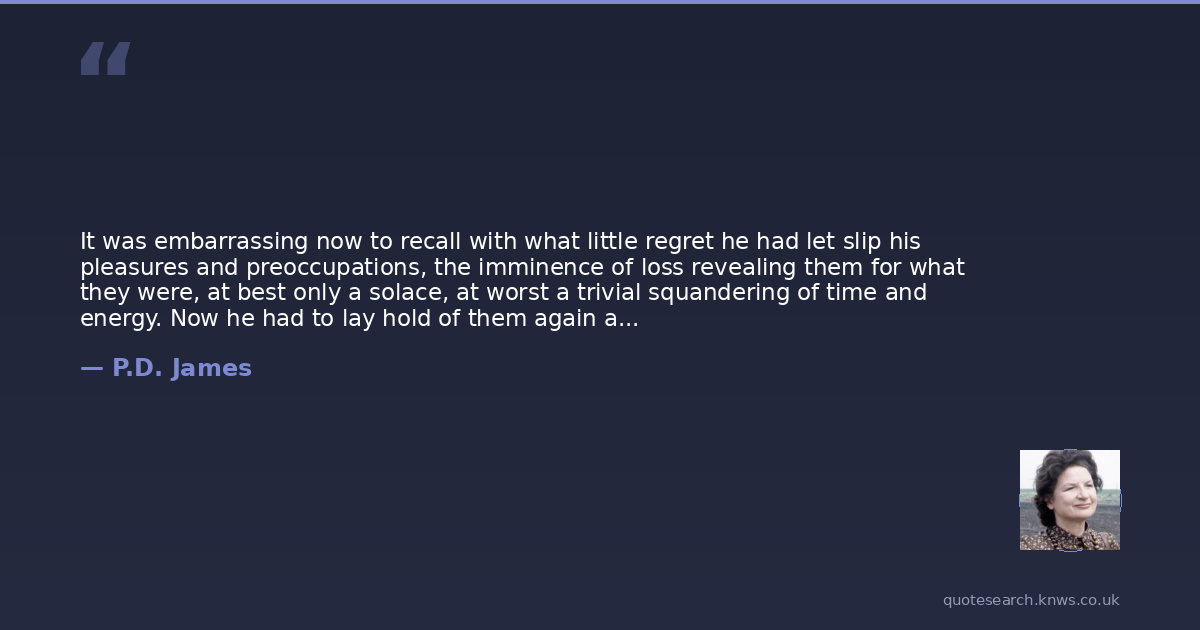 It was embarrassing now to recall with what little regret he had let slip his pleasures and preoccupations, the imminence of loss revealing them for what they were, at best only a solace, at worst a trivial squandering of time and energy. Now he had to lay hold of them again and believe that they were important, at least to himself. He doubted whether he would ever again believe them important to other people.
