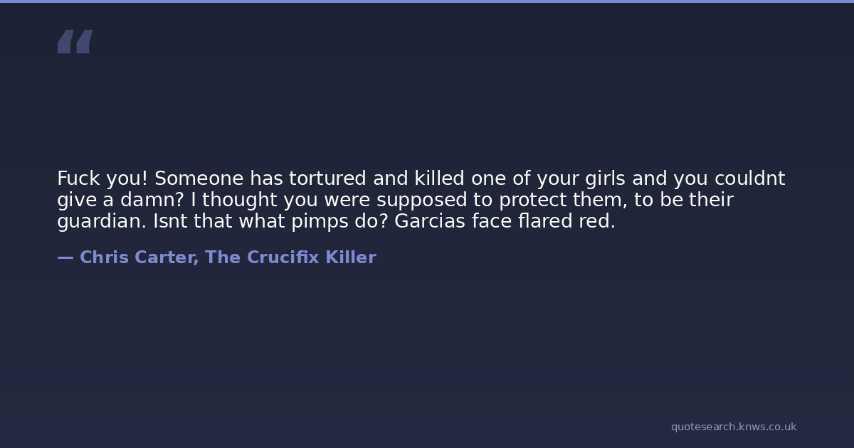 Fuck you! Someone has tortured and killed one of your girls and you couldnt give a damn? I thought you were supposed to protect them, to be their guardian. Isnt that what pimps do? Garcias face flared red.