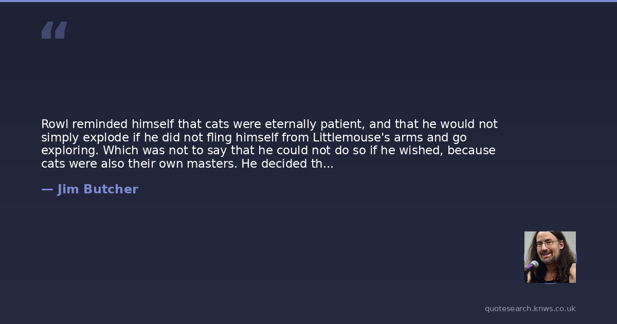 Rowl reminded himself that cats were eternally patient, and that he would not simply explode if he did not fling himself from Littlemouse's arms and go exploring. Which was not to say that he could not do so if he wished, because cats were also their own masters. He decided that his patience was practically legendary- which was fortunate...