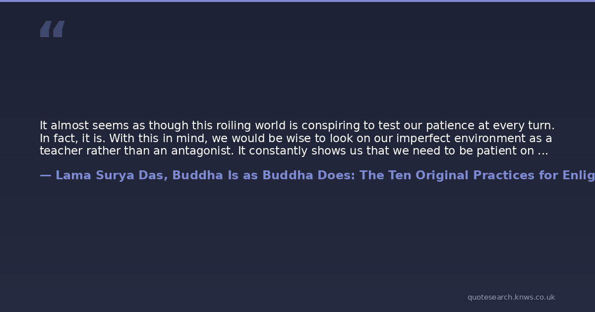 It almost seems as though this roiling world is conspiring to test our patience at every turn. In fact, it is. With this in mind, we would be wise to look on our imperfect environment as a teacher rather than an antagonist. It constantly shows us that we need to be patient on an ongoing basis, not just every now and then, if were going to realize true inner peace, happiness, and fulfillment.