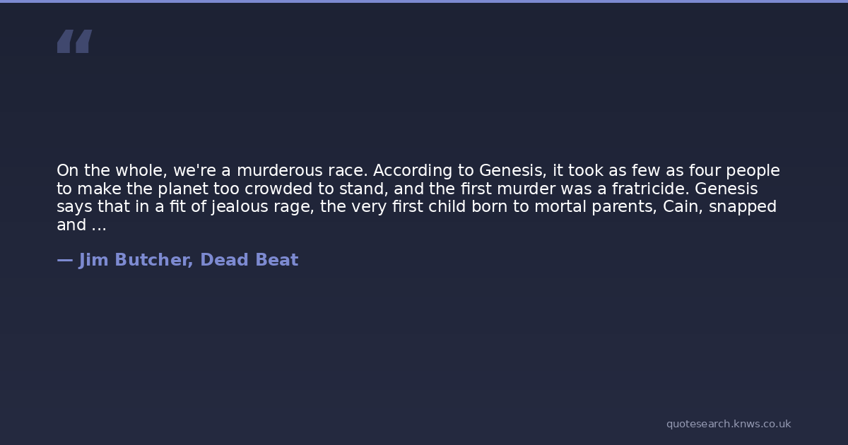On the whole, we're a murderous race. According to Genesis, it took as few as four people to make the planet too crowded to stand, and the first murder was a fratricide. Genesis says that in a fit of jealous rage, the very first child born to mortal parents, Cain, snapped and popped the first metaphorical cap in another human being. The attack was a bloody, brutal, violent, reprehensible killing. Cain's brother Abel probably never saw it coming. As I opened the door to my apartment, I was filled with a sense of empathic sympathy and intuitive understanding. For freaking Cain.