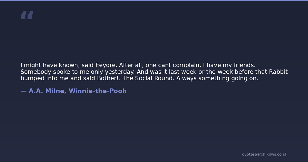 I might have known, said Eeyore. After all, one cant complain. I have my friends. Somebody spoke to me only yesterday. And was it last week or the week before that Rabbit bumped into me and said Bother!. The Social Round. Always something going on.