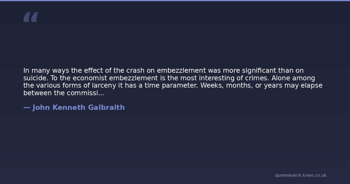 In many ways the effect of the crash on embezzlement was more significant than on suicide. To the economist embezzlement is the most interesting of crimes. Alone among the various forms of larceny it has a time parameter. Weeks, months, or years may elapse between the commission of the crime and its discovery. (This is a period, incidentally, when the embezzler has his gain and the man who has been embezzled, oddly enough, feels no loss. There is a net increase in psychic wealth.) At any given time there exists an inventory of undiscovered embezzlement in or more precisely not in the countrys businesses and banks. This inventory it should perhaps be called the bezzle amounts at any moment to many millions of dollars. It also varies in size with the business cycle. In good times people are relaxed, trusting, and money is plentiful. But even though money is plentiful, there are always many people who need more. Under these circumstances the rate of embezzlement grows, the rate of discovery falls off, and the bezzle increases rapidly. In depression all this is reversed. Money is watched with a narrow, suspicious eye. The man who handles it is assumed to be dishonest until he proves himself otherwise. Audits are penetrating and meticulous. Commercial morality is enormously improved. The bezzle shrinks.Just as the boom accelerated the rate of growth, so the crash enormously advanced the rate of discovery. Within a few days, something close to a universal trust turned into something akin to universal suspicion. Audits were ordered. Strained or preoccupied behavior was noticed. Most important, the collapse in stock values made irredeemable the position of the employee who had embezzled to play the market. He now confessed.