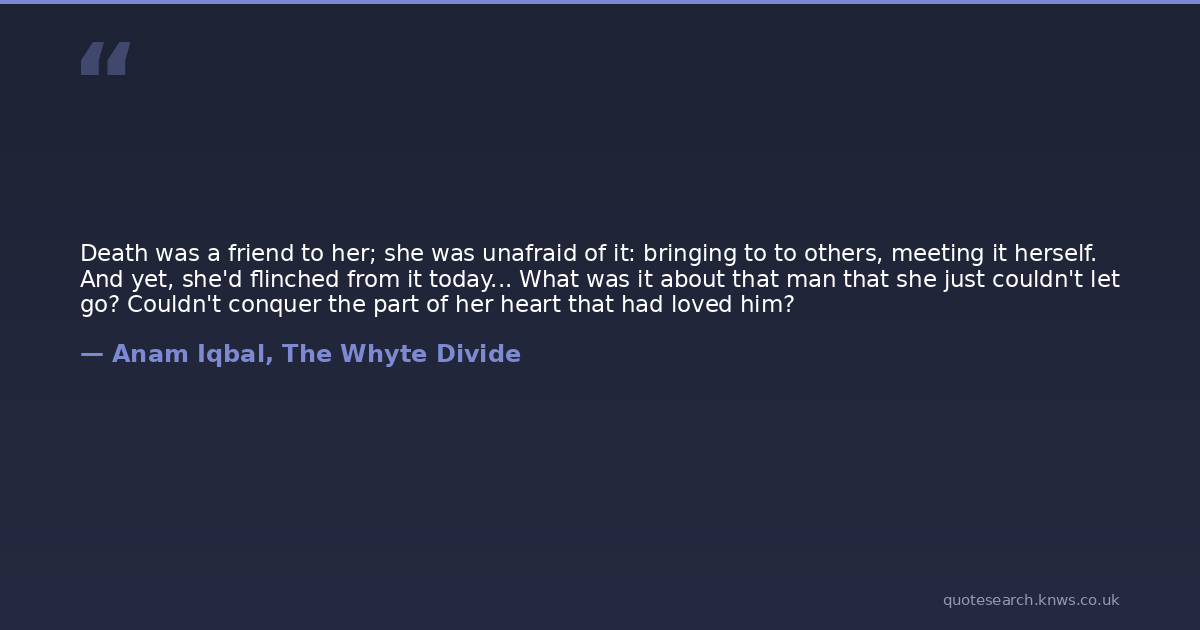 Death was a friend to her; she was unafraid of it: bringing to to others, meeting it herself. And yet, she'd flinched from it today... What was it about that man that she just couldn't let go? Couldn't conquer the part of her heart that had loved him?