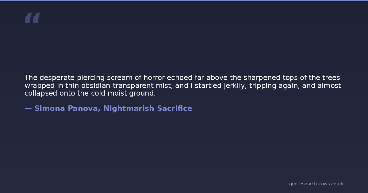The desperate piercing scream of horror echoed far above the sharpened tops of the trees wrapped in thin obsidian-transparent mist, and I startled jerkily, tripping again, and almost collapsed onto the cold moist ground.