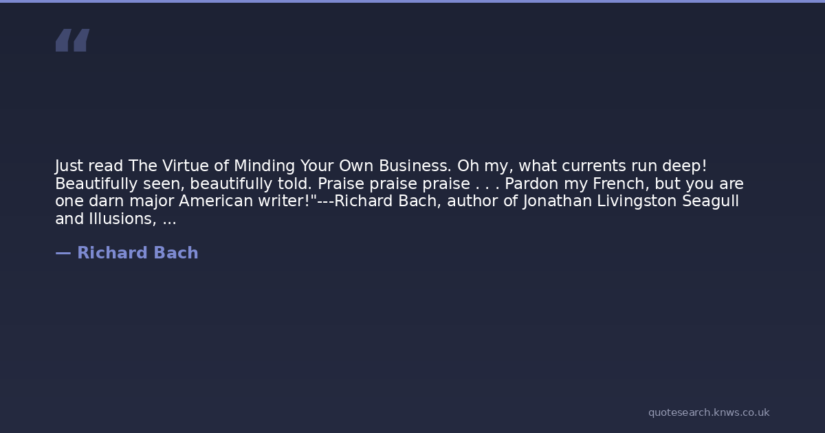 Just read The Virtue of Minding Your Own Business. Oh my, what currents run deep! Beautifully seen, beautifully told. Praise praise praise . . . Pardon my French, but you are one darn major American writer!"---Richard Bach, author of Jonathan Livingston Seagull and Illusions, on Sandcastle and Other Stories