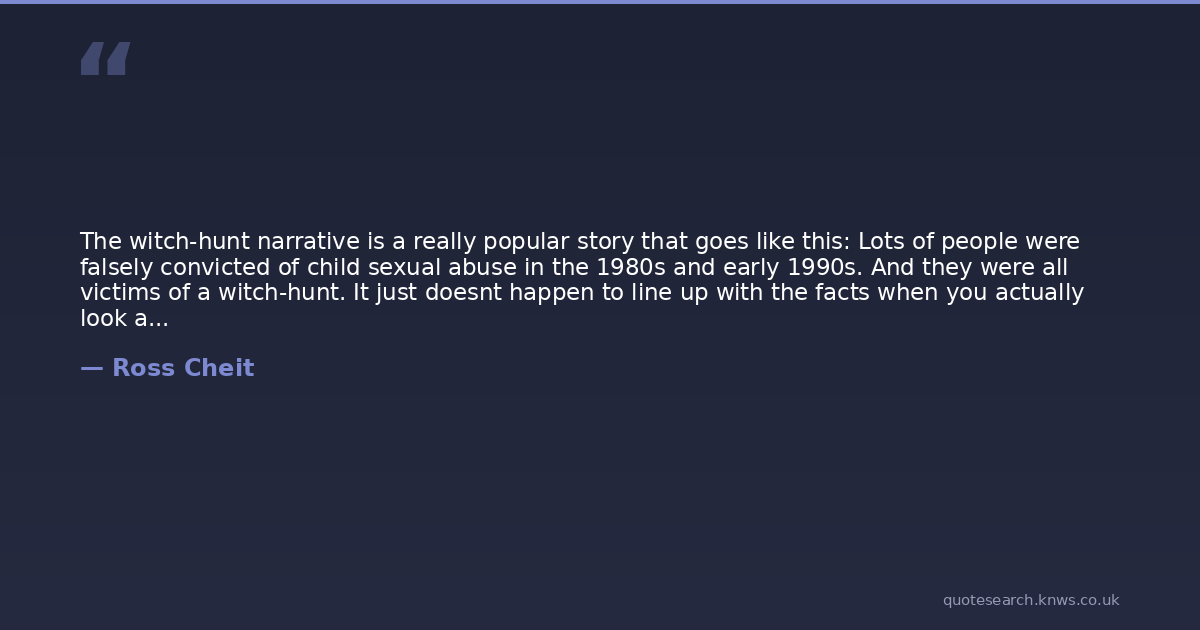 The witch-hunt narrative is a really popular story that goes like this: Lots of people were falsely convicted of child sexual abuse in the 1980s and early 1990s. And they were all victims of a witch-hunt. It just doesnt happen to line up with the facts when you actually look at the cases themselves in detail. But its a really popular narrative I think its absolutely fair to say thats the conventional wisdom. Its what most people now think is the uncontested truth, and those cases had no basis in fact. And what 15 years of painstaking trial court research (says) is that thats not a very fair description of those cases, and in fact many of those cases had substantial evidence of abuse. The witch-hunt narrative is that these were all gross injustices to the defendant. In fact, what it looks like in retrospect is the injustices were much more often to children.