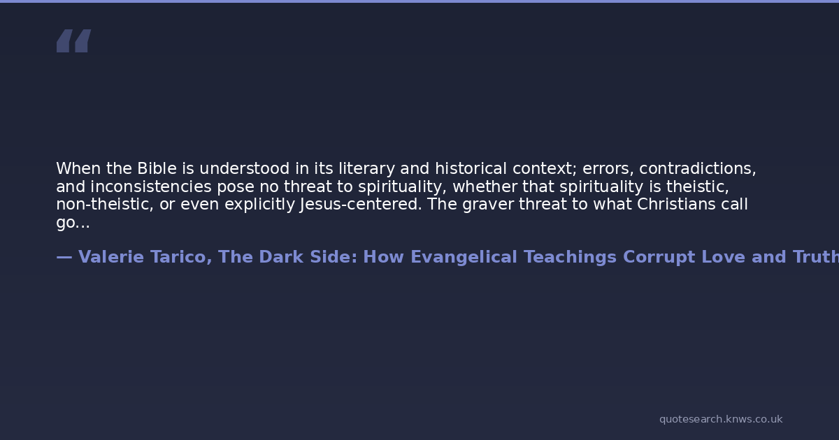 When the Bible is understood in its literary and historical context; errors, contradictions, and inconsistencies pose no threat to spirituality, whether that spirituality is theistic, non-theistic, or even explicitly Jesus-centered. The graver threat to what Christians call godliness may be fundamentalism - religion that flows from literalism and fear, religion based on anachronism and law. Fundamentalism teachers, in effect, that the tattered musings of our ancestors, those human words that so poorly represent the content of human thinking, somehow adequately describe God. Fundamentalism offers identity, security, and simplicity, but at a price: by binding believers to the moral imitations and cultural trappings of the Ancients, it precludes a deeper embrace of goodness, love, and truth - in other words, of Divinity.