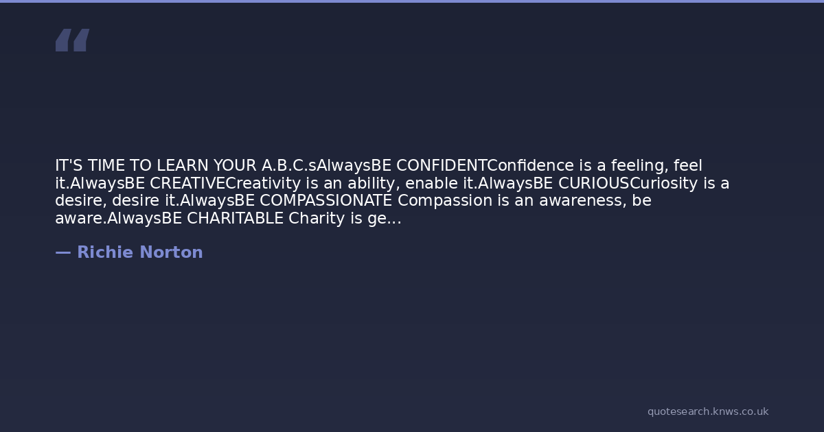 IT'S TIME TO LEARN YOUR A.B.C.sAlwaysBE CONFIDENTConfidence is a feeling, feel it.AlwaysBE CREATIVECreativity is an ability, enable it.AlwaysBE CURIOUSCuriosity is a desire, desire it.AlwaysBE COMPASSIONATE Compassion is an awareness, be aware.AlwaysBE CHARITABLE Charity is generous, be generous.AlwaysBE CONSIDERATEConsideration is thoughtful, think.AlwaysBE COURTEOUSCourtesy is a mindset, be mindful.AlwaysBE COACHABLECoachability is a willingness, be willing.AlwaysBE COMMITTEDCommitment is purpose, live on purpose.AlwaysBE CARINGCaring is giving, give.