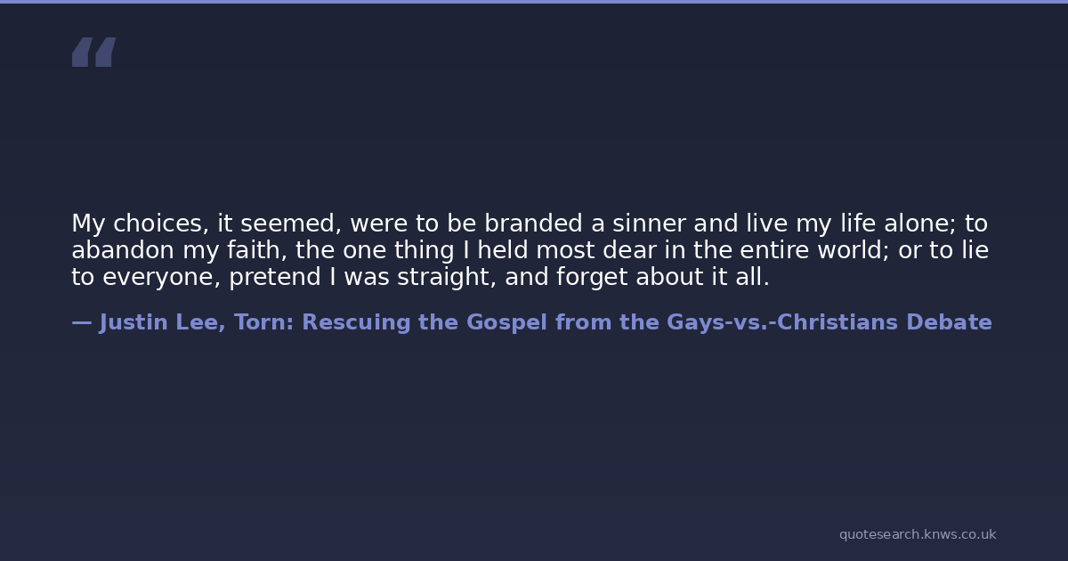 My choices, it seemed, were to be branded a sinner and live my life alone; to abandon my faith, the one thing I held most dear in the entire world; or to lie to everyone, pretend I was straight, and forget about it all.