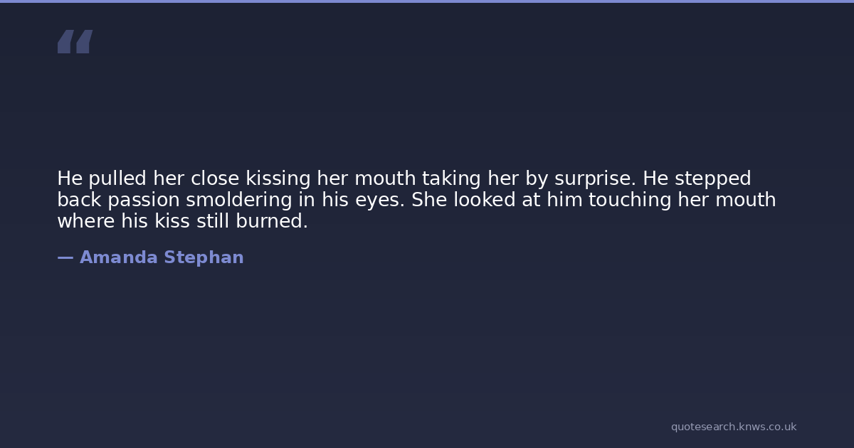 He pulled her close kissing her mouth taking her by surprise. He stepped back passion smoldering in his eyes. She looked at him touching her mouth where his kiss still burned.