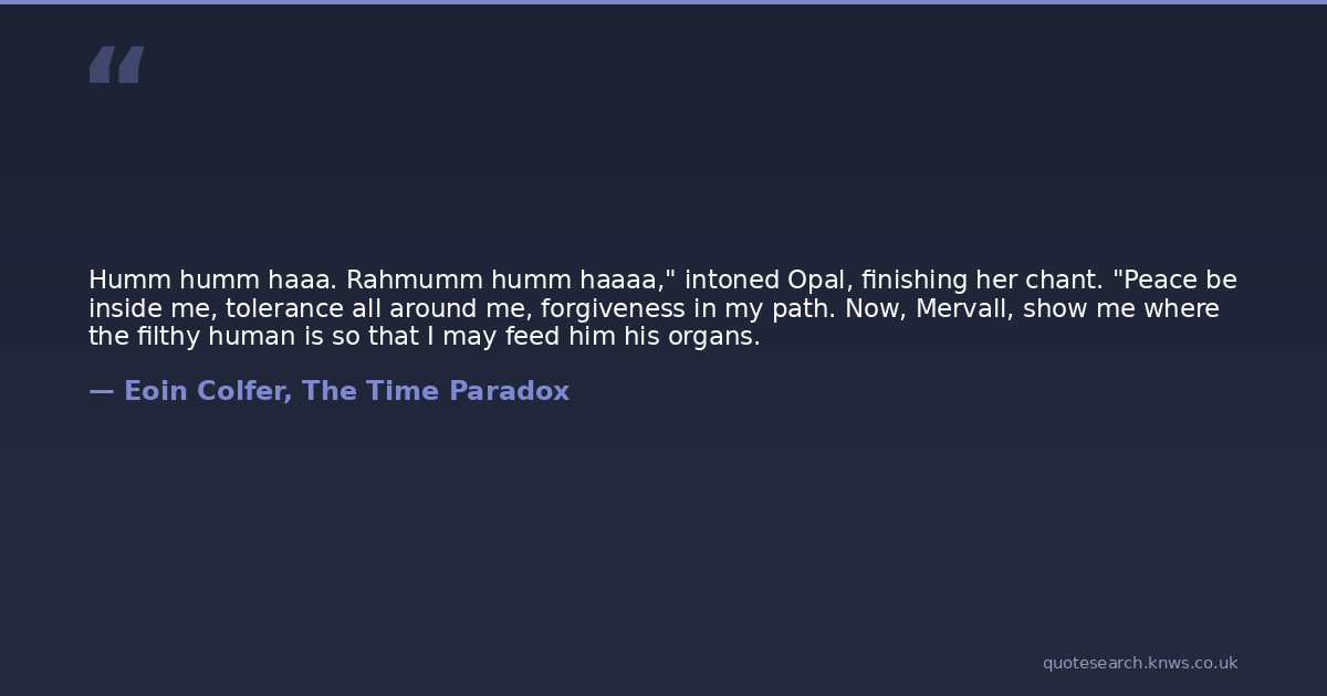 Humm humm haaa. Rahmumm humm haaaa," intoned Opal, finishing her chant. "Peace be inside me, tolerance all around me, forgiveness in my path. Now, Mervall, show me where the filthy human is so that I may feed him his organs.