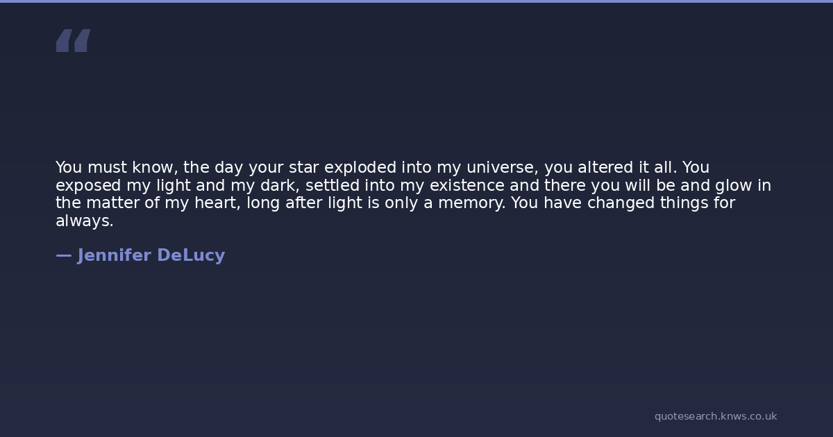 You must know, the day your star exploded into my universe, you altered it all. You exposed my light and my dark, settled into my existence and there you will be and glow in the matter of my heart, long after light is only a memory. You have changed things for always.