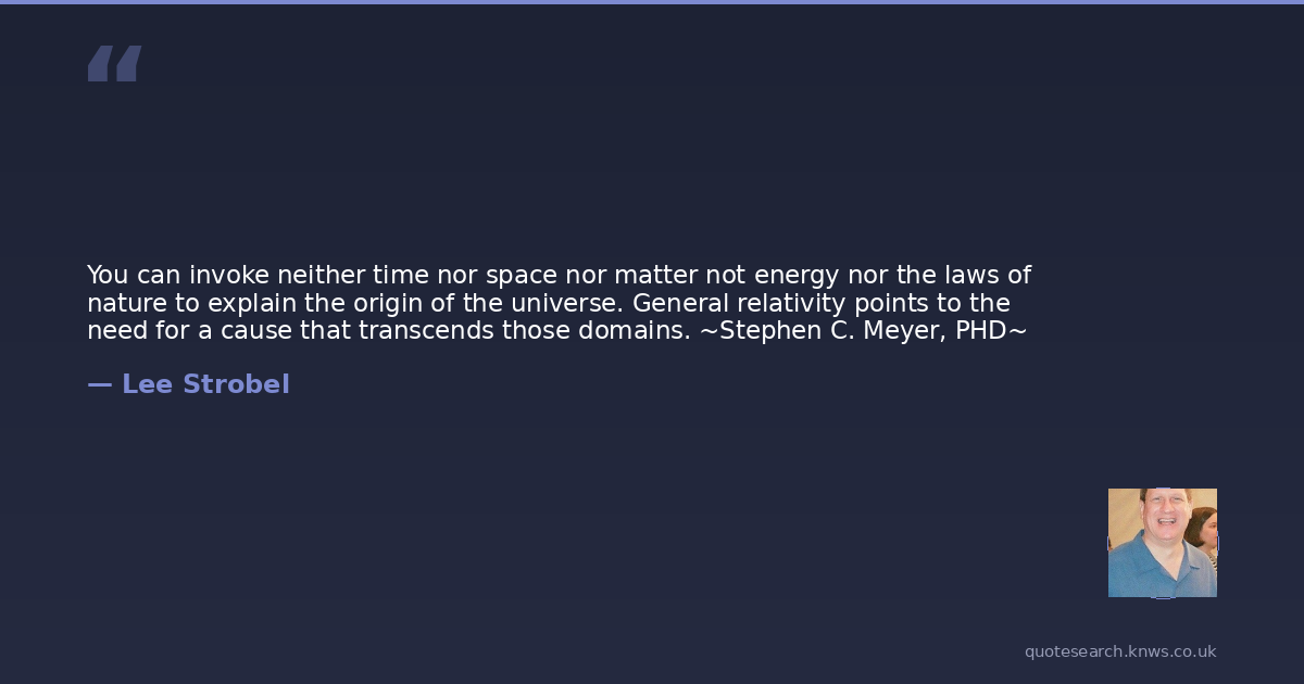 You can invoke neither time nor space nor matter not energy nor the laws of nature to explain the origin of the universe. General relativity points to the need for a cause that transcends those domains. ~Stephen C. Meyer, PHD~