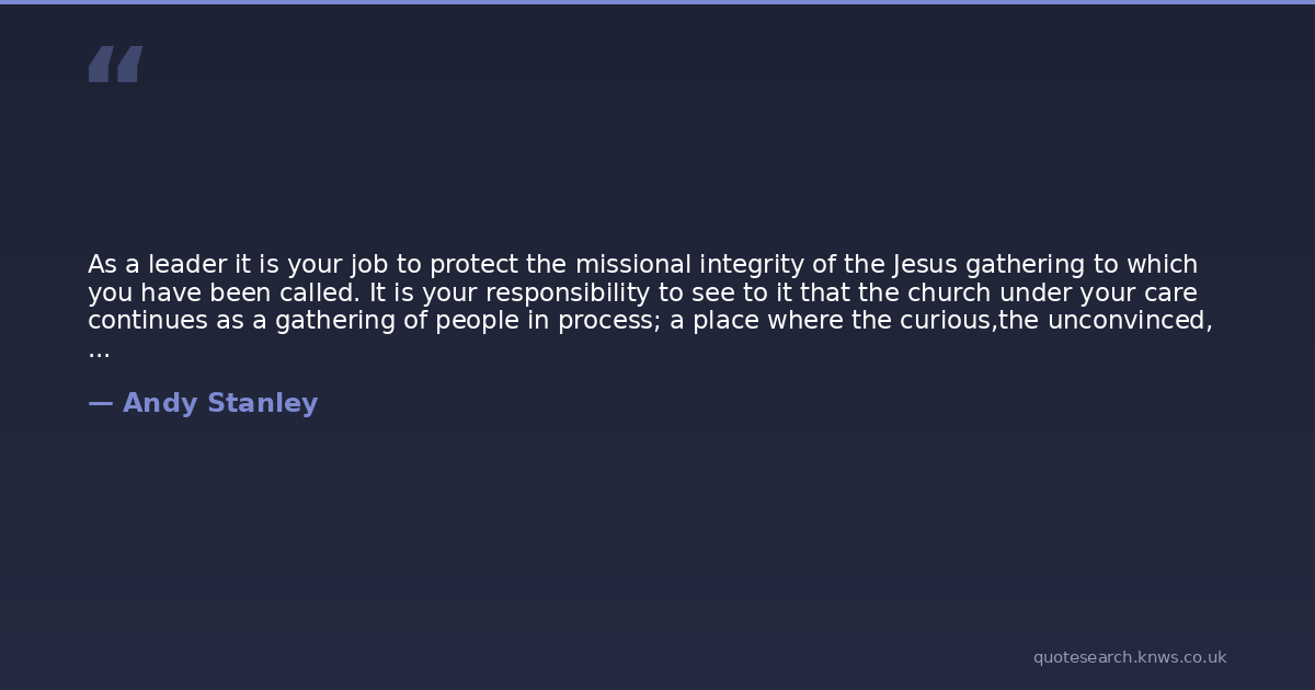 As a leader it is your job to protect the missional integrity of the Jesus gathering to which you have been called. It is your responsibility to see to it that the church under your care continues as a gathering of people in process; a place where the curious,the unconvinced, the sceptical, the used-to-believe and the broken, as well as the committed, informed and sold-out come together around Peter's declaration that Jesus is the Christ, the Son of the living God.