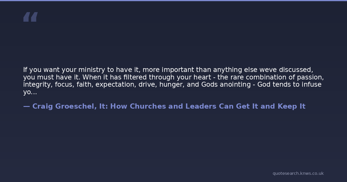 If you want your ministry to have it, more important than anything else weve discussed, you must have it. When it has filtered through your heart - the rare combination of passion, integrity, focus, faith, expectation, drive, hunger, and Gods anointing - God tends to infuse your ministry with it. He blesses your work. People are changed. Leaders grow. Resources flow. The ministry seems to take on a life of its own.