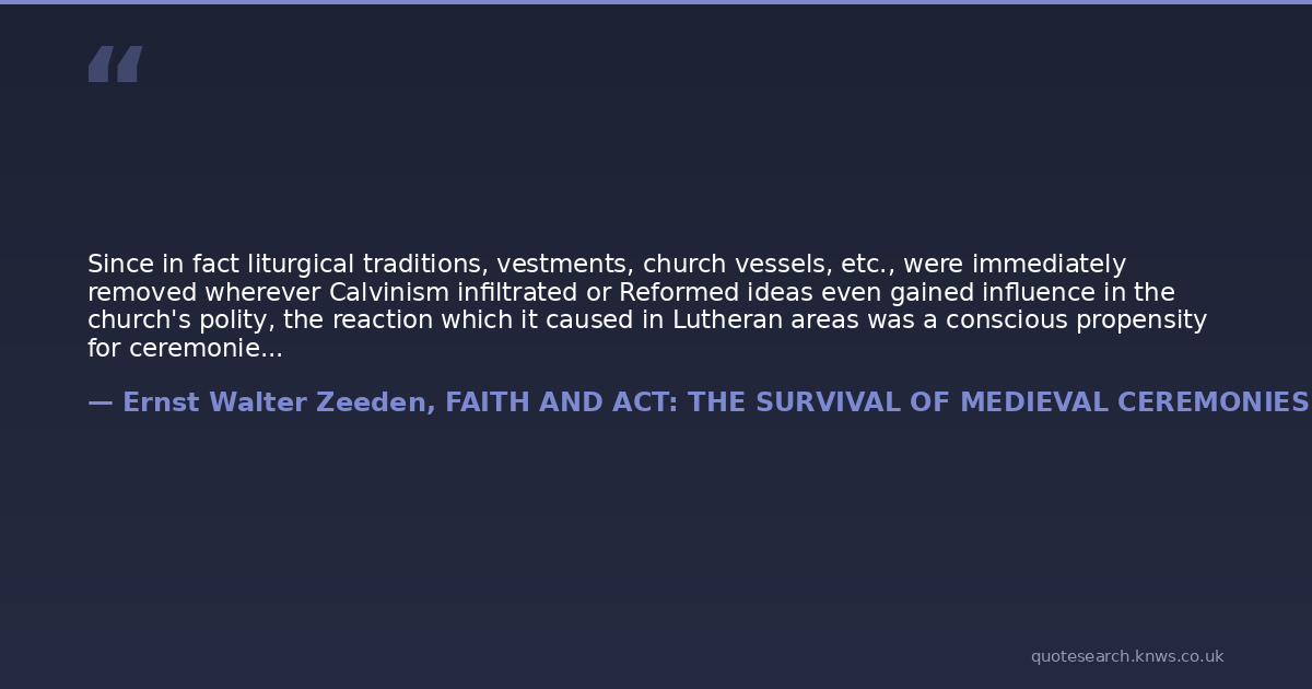 Since in fact liturgical traditions, vestments, church vessels, etc., were immediately removed wherever Calvinism infiltrated or Reformed ideas even gained influence in the church's polity, the reaction which it caused in Lutheran areas was a conscious propensity for ceremonies. Henceforth, therefore, the celebration of an emphatically liturgical service was among the visible signs by which the Lutheran character of confession was demonstrated outwardly.