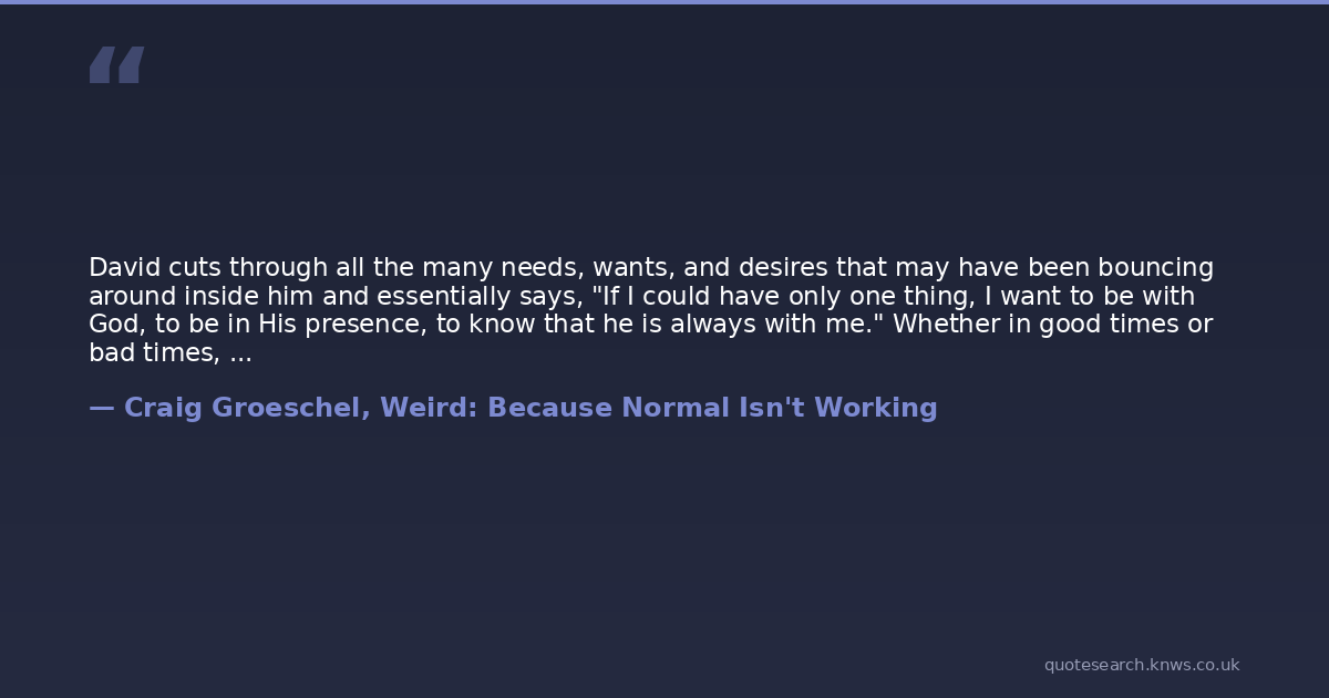 David cuts through all the many needs, wants, and desires that may have been bouncing around inside him and essentially says, "If I could have only one thing, I want to be with God, to be in His presence, to know that he is always with me." Whether in good times or bad times, David knew the thing he needed most: to feel God's presence close by, intimately, through worship.