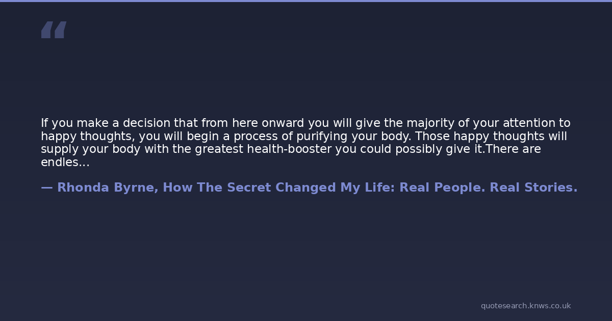 If you make a decision that from here onward you will give the majority of your attention to happy thoughts, you will begin a process of purifying your body. Those happy thoughts will supply your body with the greatest health-booster you could possibly give it.There are endless excuses not to be happy. But if you put happiness off by saying "I'll be happy when..." you'll not only be delaying happiness for the rest of your life, you'll also be diminishing the health of your body. Happiness is your body's miracle elixir, so be happy NOW, no excuses!