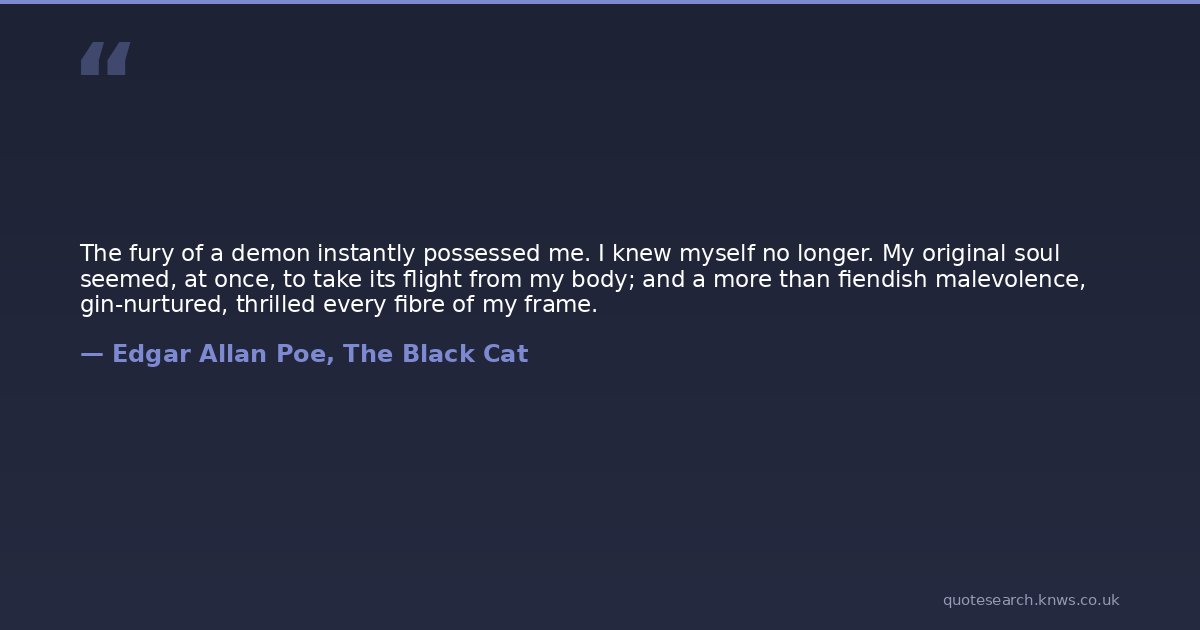 The fury of a demon instantly possessed me. I knew myself no longer. My original soul seemed, at once, to take its flight from my body; and a more than fiendish malevolence, gin-nurtured, thrilled every fibre of my frame.
