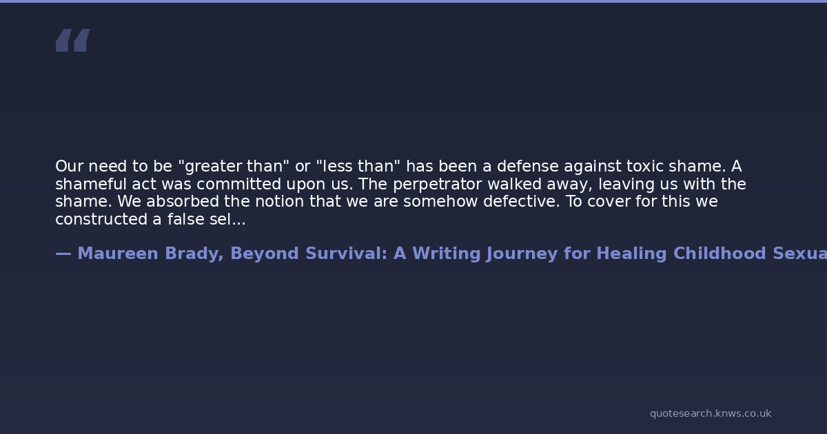 Our need to be "greater than" or "less than" has been a defense against toxic shame. A shameful act was committed upon us. The perpetrator walked away, leaving us with the shame. We absorbed the notion that we are somehow defective. To cover for this we constructed a false self, a masked self. And it is this self that is the overachiever or the dunce, the tramp or the puritan, the powermonger or the pathetic loser.