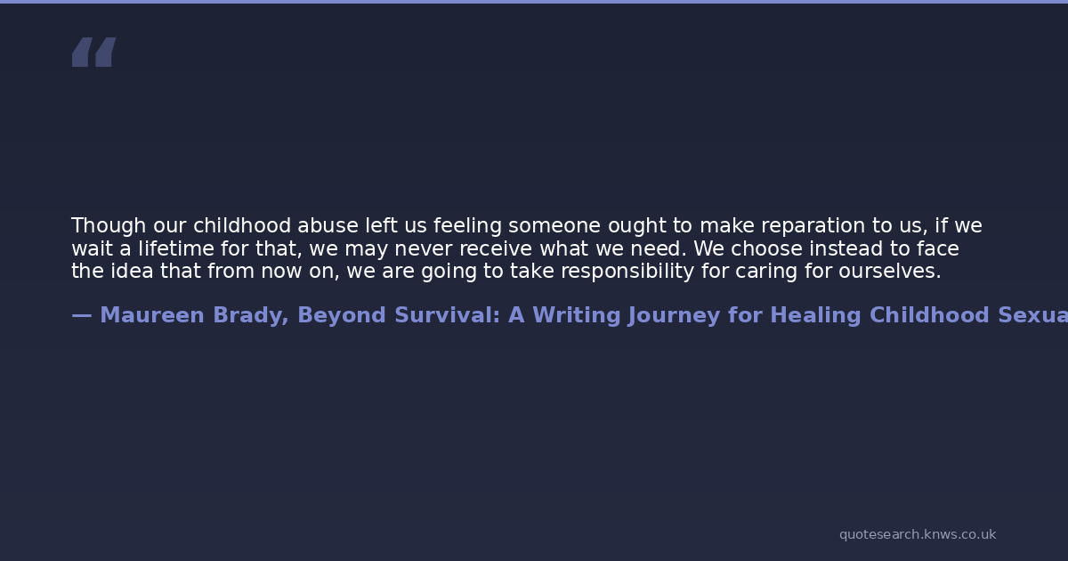 Though our childhood abuse left us feeling someone ought to make reparation to us, if we wait a lifetime for that, we may never receive what we need. We choose instead to face the idea that from now on, we are going to take responsibility for caring for ourselves.