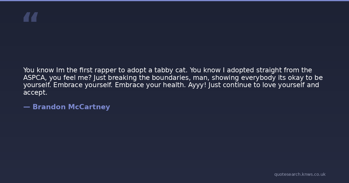 You know Im the first rapper to adopt a tabby cat. You know I adopted straight from the ASPCA, you feel me? Just breaking the boundaries, man, showing everybody its okay to be yourself. Embrace yourself. Embrace your health. Ayyy! Just continue to love yourself and accept.