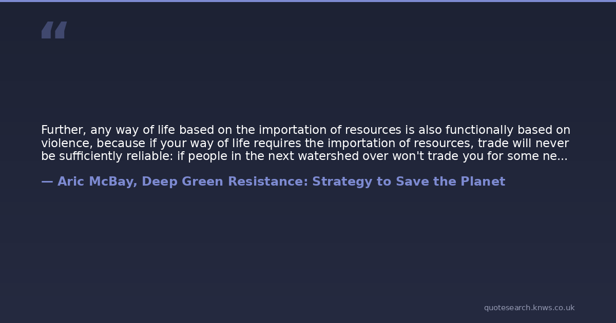 Further, any way of life based on the importation of resources is also functionally based on violence, because if your way of life requires the importation of resources, trade will never be sufficiently reliable: if people in the next watershed over won't trade you for some necessary resource, you will take it, because you need it. So, to bring this to the present, we could all become enlightened, and the US military would still have to be huge: how else will they get access to the oil they need to run the economy, oil that just happens to lie under someone else's land? The point is that no matter what we think of the irredeemability of this culture's mass psychology or system of rewards, this culturecivilizationis also irredeemable on a purely functional level.