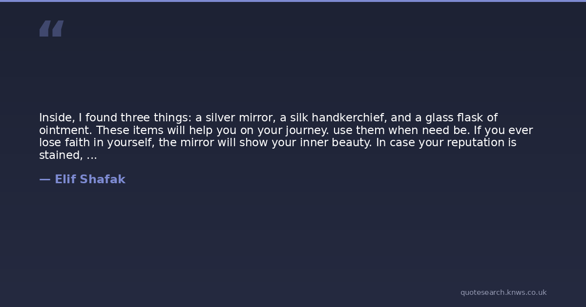 Inside, I found three things: a silver mirror, a silk handkerchief, and a glass flask of ointment. These items will help you on your journey. use them when need be. If you ever lose faith in yourself, the mirror will show your inner beauty. In case your reputation is stained, the handkerchief will remind you of how pure your heart is. As for the balm, it will heal your wounds, both inside and outside.
