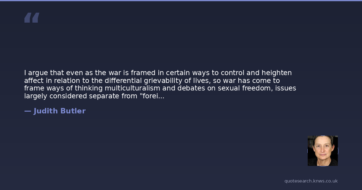 I argue that even as the war is framed in certain ways to control and heighten affect in relation to the differential grievability of lives, so war has come to frame ways of thinking multiculturalism and debates on sexual freedom, issues largely considered separate from "foreign affairs.