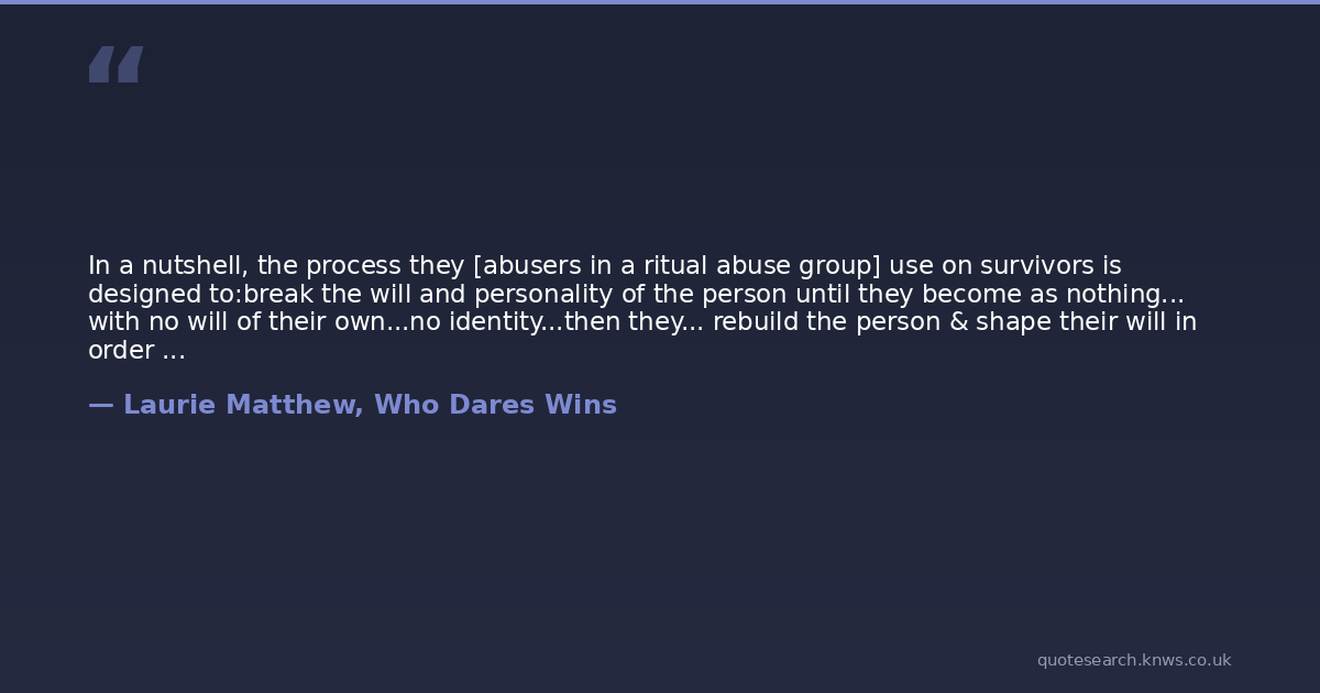 In a nutshell, the process they [abusers in a ritual abuse group] use on survivors is designed to:break the will and personality of the person until they become as nothing... with no will of their own...no identity...then they... rebuild the person & shape their will in order to...try and make the person one of them...thus gaining powerIf abusers hold all the power, becoming one of them can, for some, be the only means of survival. However, this doesn't always work, instead survivors often find ways of regaining their own power and fighting back.