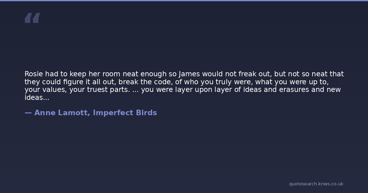 Rosie had to keep her room neat enough so James would not freak out, but not so neat that they could figure it all out, break the code, of who you truly were, what you were up to, your values, your truest parts. ... you were layer upon layer of ideas and erasures and new ideas and soul and images. [p. 68]
