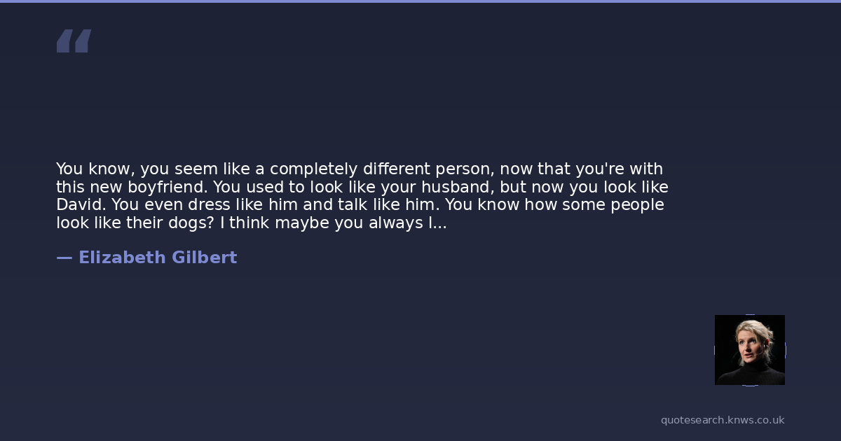 You know, you seem like a completely different person, now that you're with this new boyfriend. You used to look like your husband, but now you look like David. You even dress like him and talk like him. You know how some people look like their dogs? I think maybe you always look like your men.