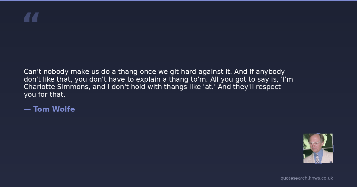 Can't nobody make us do a thang once we git hard against it. And if anybody don't like that, you don't have to explain a thang to'm. All you got to say is, 'I'm Charlotte Simmons, and I don't hold with thangs like 'at.' And they'll respect you for that.
