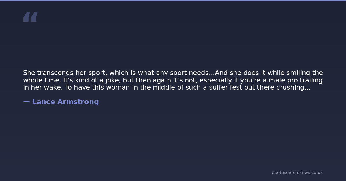 She transcends her sport, which is what any sport needs...And she does it while smiling the whole time. It's kind of a joke, but then again it's not, especially if you're a male pro trailing in her wake. To have this woman in the middle of such a suffer fest out there crushing people and smiling all the way...