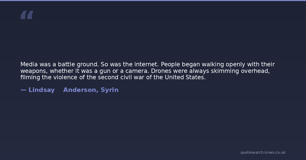Media was a battle ground. So was the internet. People began walking openly with their weapons, whether it was a gun or a camera. Drones were always skimming overhead, filming the violence of the second civil war of the United States.