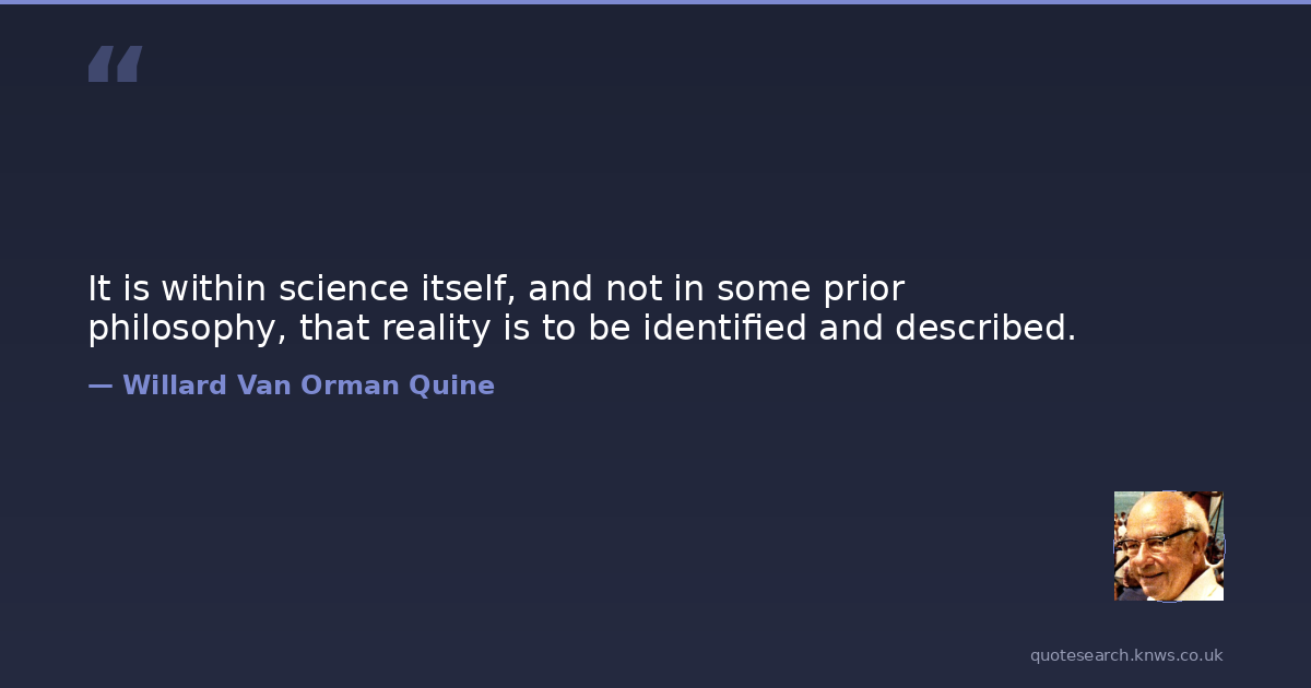 Willard Van Orman Quine was a 20th-century American philosopher and logician. Willard Van Orman Quine was an American philosopher and logician in the analytic tradition, recognized as "one of the most influential philosophers of the twentieth century". He was the Edgar Pierce Chair of Philosophy at Harvard University from 1956 to 1978. Read more on Wikipedia →