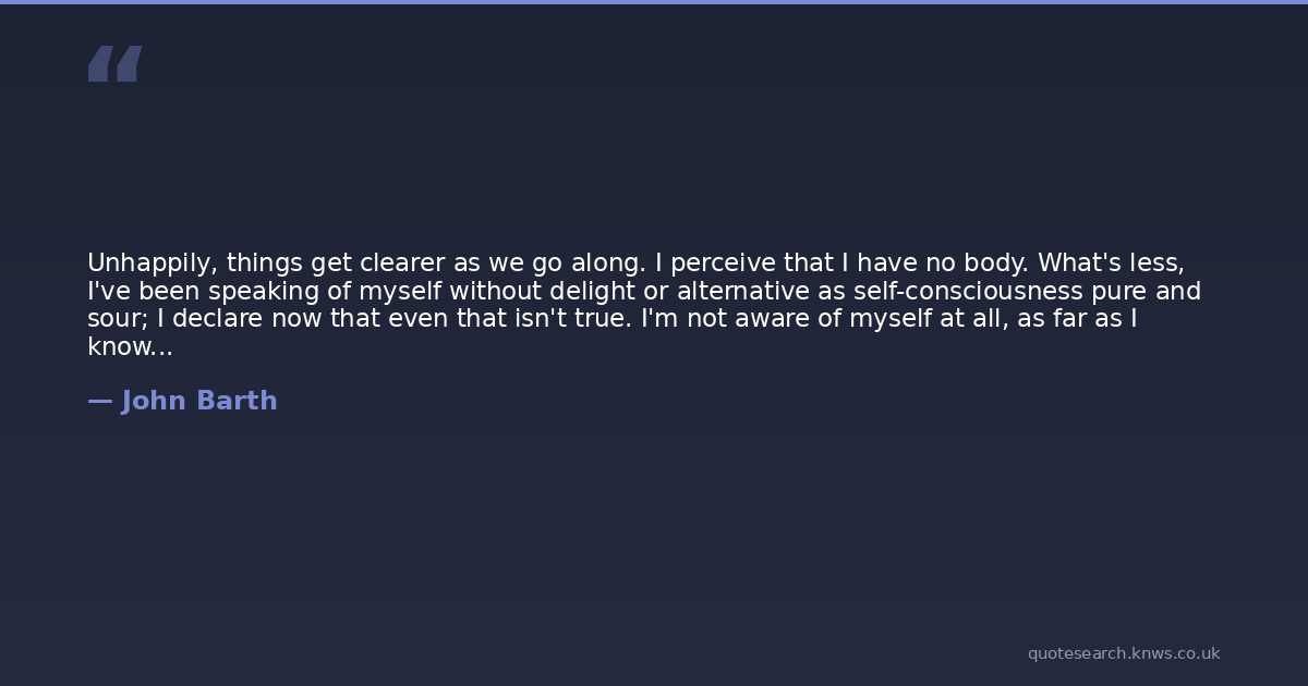 Unhappily, things get clearer as we go along. I perceive that I have no body. What's less, I've been speaking of myself without delight or alternative as self-consciousness pure and sour; I declare now that even that isn't true. I'm not aware of myself at all, as far as I know. I don't think. . . I know what I'm talking about.