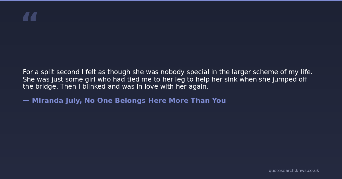 For a split second I felt as though she was nobody special in the larger scheme of my life. She was just some girl who had tied me to her leg to help her sink when she jumped off the bridge. Then I blinked and was in love with her again.