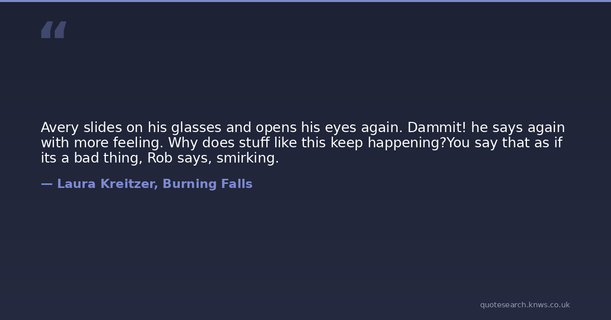 Avery slides on his glasses and opens his eyes again. Dammit! he says again with more feeling. Why does stuff like this keep happening?You say that as if its a bad thing, Rob says, smirking.