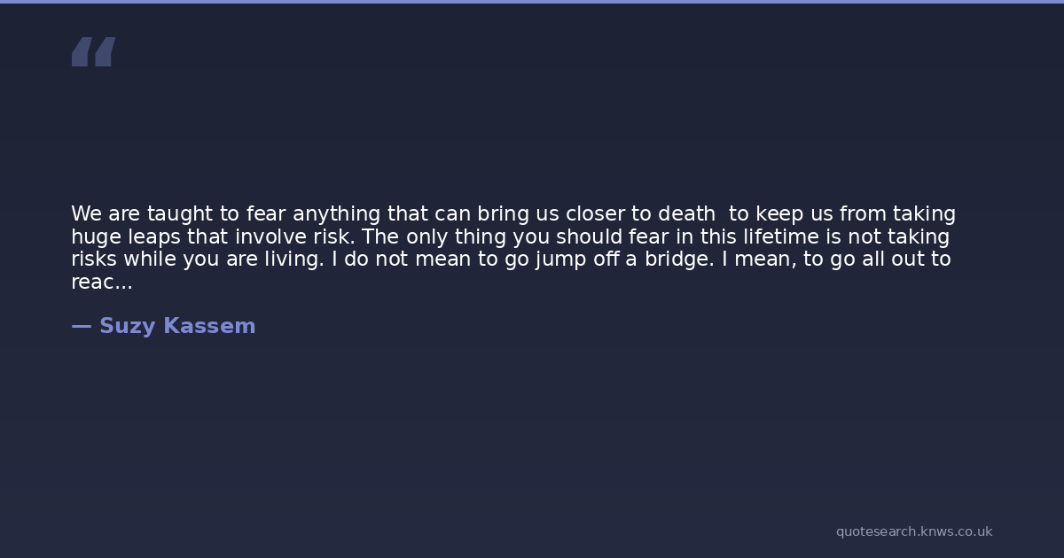 We are taught to fear anything that can bring us closer to death to keep us from taking huge leaps that involve risk. The only thing you should fear in this lifetime is not taking risks while you are living. I do not mean to go jump off a bridge. I mean, to go all out to reach your dreams, to dare to do things you typically would not do out of fear. Pain has a threshold and so does death. Fear neither, and never fear what has no right to be feared.