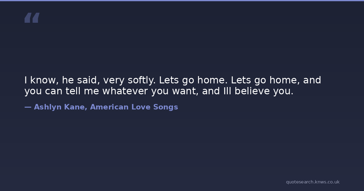 I know, he said, very softly. Lets go home. Lets go home, and you can tell me whatever you want, and Ill believe you.