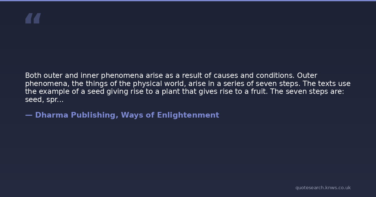 Both outer and inner phenomena arise as a result of causes and conditions. Outer phenomena, the things of the physical world, arise in a series of seven steps. The texts use the example of a seed giving rise to a plant that gives rise to a fruit. The seven steps are: seed, sprout, leaflets, stemmed plant, bud, flower, fruit. Each stage succeeds the previous one in time and in order, each giving rise to the next.
