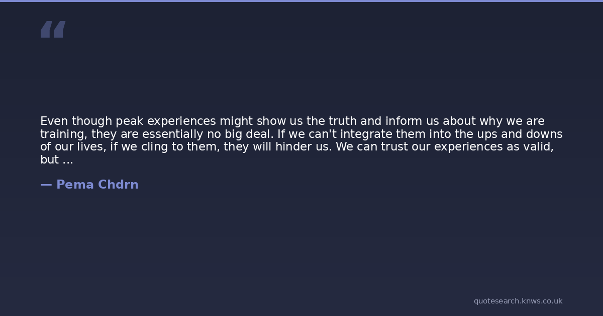 Even though peak experiences might show us the truth and inform us about why we are training, they are essentially no big deal. If we can't integrate them into the ups and downs of our lives, if we cling to them, they will hinder us. We can trust our experiences as valid, but then we have to move on and learn how to get along with our neighbors. Then even the most remarkable insights can begin to permeate our lives. As the twelfth-century Tibetian yogi Milarepa said when he heard of his student Gampopa's peak experiences, 'They are neither good not bad. Keep meditation.'
