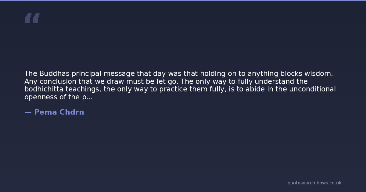 The Buddhas principal message that day was that holding on to anything blocks wisdom. Any conclusion that we draw must be let go. The only way to fully understand the bodhichitta teachings, the only way to practice them fully, is to abide in the unconditional openness of the prajna, patiently cutting through all our tendencies to hang on.