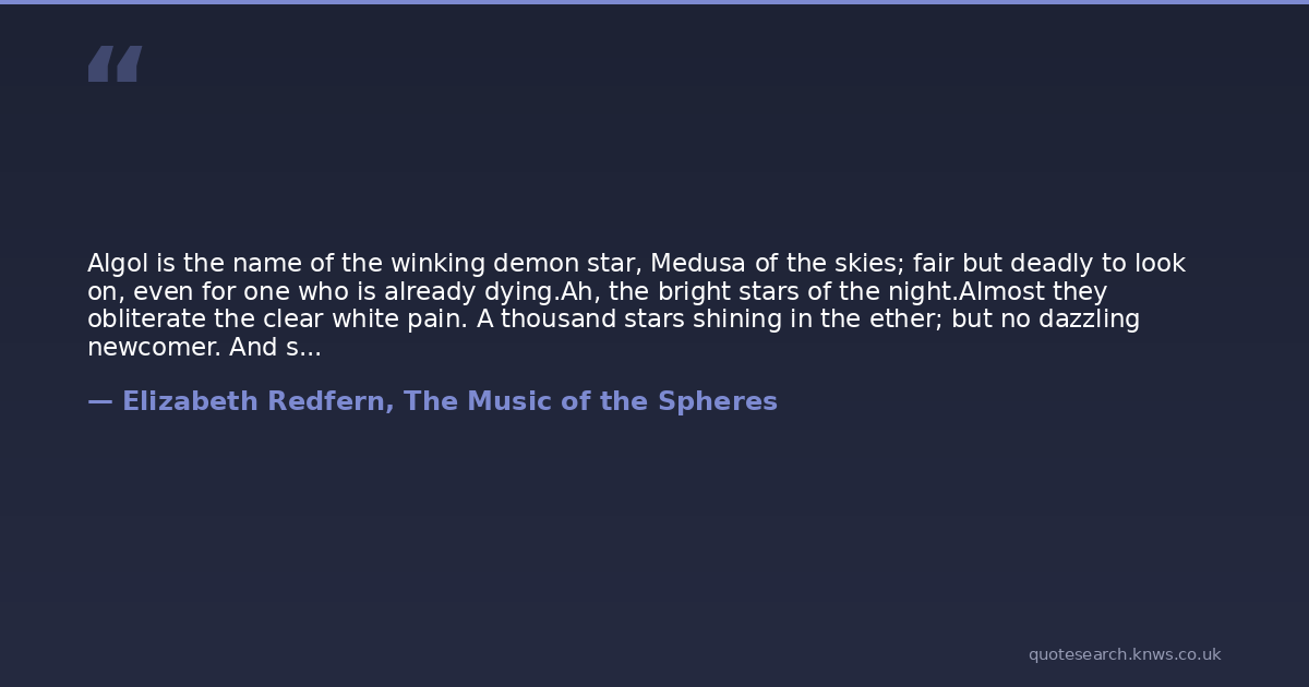 Algol is the name of the winking demon star, Medusa of the skies; fair but deadly to look on, even for one who is already dying.Ah, the bright stars of the night.Almost they obliterate the clear white pain. A thousand stars shining in the ether; but no dazzling newcomer. And so little time left, so little time...Yet still two-faced Medusa laughs from behind the clouds, demanding homage. Homage, Medusa, or a sword, a blade sharper than death itself.The wind stirs. Night clouds obscure the universe. A lower music now, a different kind of death.No stars tonight, my love.No Selene.