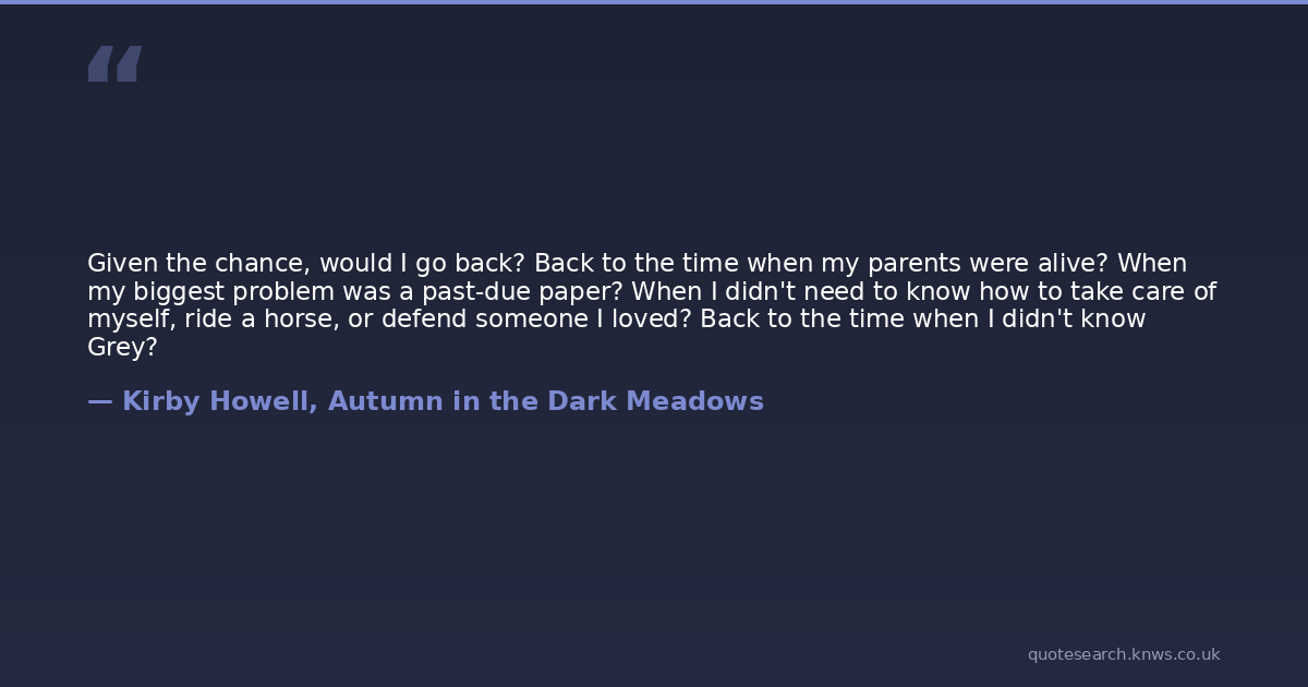 Given the chance, would I go back? Back to the time when my parents were alive? When my biggest problem was a past-due paper? When I didn't need to know how to take care of myself, ride a horse, or defend someone I loved? Back to the time when I didn't know Grey?