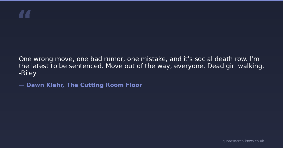 One wrong move, one bad rumor, one mistake, and it's social death row. I'm the latest to be sentenced. Move out of the way, everyone. Dead girl walking. -Riley