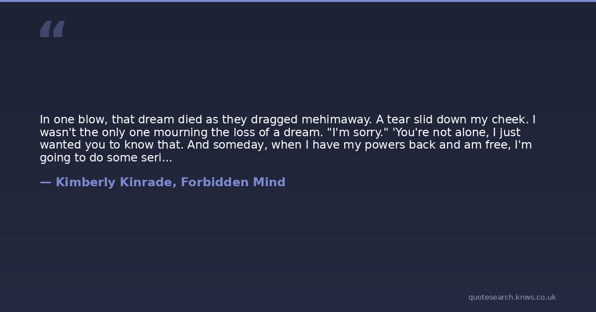 In one blow, that dream died as they dragged mehimaway. A tear slid down my cheek. I wasn't the only one mourning the loss of a dream. "I'm sorry." 'You're not alone, I just wanted you to know that. And someday, when I have my powers back and am free, I'm going to do some serious damage to the people who've hurt you.