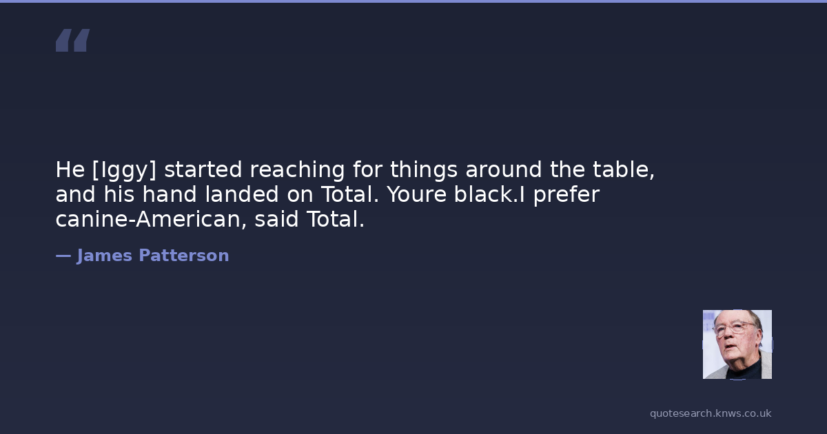 He [Iggy] started reaching for things around the table, and his hand landed on Total. Youre black.I prefer canine-American, said Total.